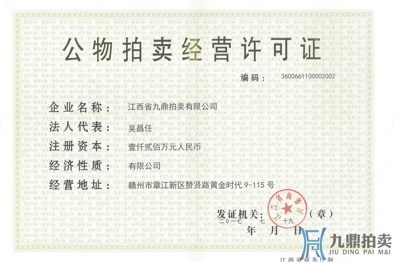 江西省九鼎拍賣(mài)有限公司是嚴(yán)格按照《中華人民共和國(guó)公司法》、《中華人民共和國(guó)拍賣(mài)法》等有關(guān)法律法規(guī)而成立的拍賣(mài)機(jī)構(gòu),是國(guó)家A級(jí)資質(zhì)拍賣(mài)企業(yè)、中國(guó)拍賣(mài)行業(yè)協(xié)會(huì)會(huì)員單位、江西省公物拍賣(mài)指定單位、江西省拍賣(mài)行業(yè)協(xié)會(huì)常務(wù)理事單位,是目前江西省規(guī)模較大、起點(diǎn)較高的專(zhuān)業(yè)拍賣(mài)單位。公司遵照《中華人民共和國(guó)合同法》、《中華人民共和國(guó)拍賣(mài)法》等法律法規(guī)、政策,依法接受公民、法人或其他組織的委托,并提供財(cái)產(chǎn)鑒定評(píng)估、過(guò)戶(hù)代理等業(yè)務(wù)。